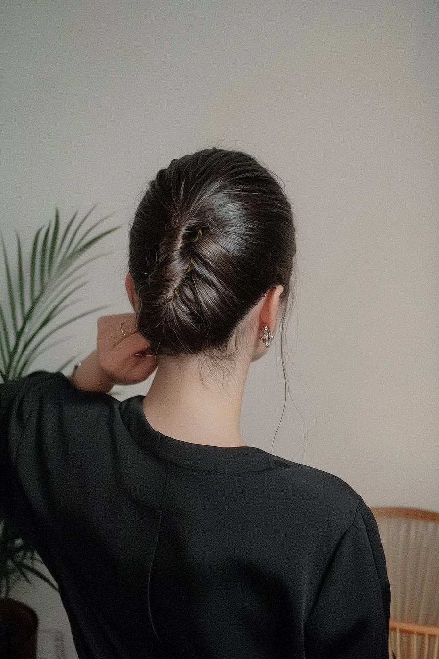 Insert the pin by slightly spreading the prongs to secure your hairstyle, then slide it against the scalp for a firm hold.